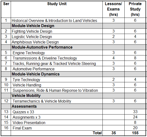 Students must complete all mandatory readings, course assessments and exams within a 15 week period. Upon successful completion of all studies, students are awarded a Diploma in Military Technology (Vehicles & Mobility). At the completion of the course, students who have meet the course requirements will be issued a Diploma certificate. This course is offered on a non-accredited basis.